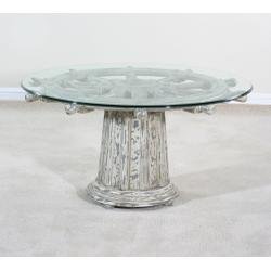 45177CK Features: 12mm glass stepped edge top Hand pointed resin captains wheel top Finish: Glass Top / Distressed White Dimensions: 39"(W) x 39"(D) x 19.5"(H)