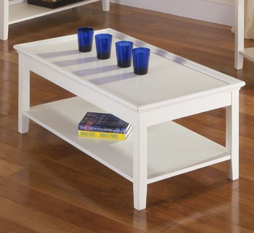 Riverside Splash Of Color Shores White Tray Top Cocktail Table Constructed of Poplar hardwood solids and engineered wood Top features tray-top edging One fixed bottom shelf Finish: Shores White Dimensions: 46(W) x 24(D) x 18(H)