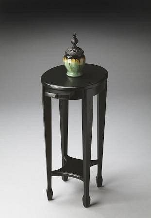 Cherry veneer top. Lower shelf. Pull out tray with antique brass hardware. Made from selected hardwood and veneers. Black licorice finish. 15 in. W x 12 in. D x 26 in. H (10 lbs.) This attractive accent table is perfectly proportioned to sit beside an easy chair or serve as a bedside table. Masterpiece represents Butler's hand-picked collection of lifestyle pieces for those with discriminating tastes and a desire to be different. This collection is, above all, eclectic, offering a wide range of styles designed to provide bright accents for traditional to contemporary decors.